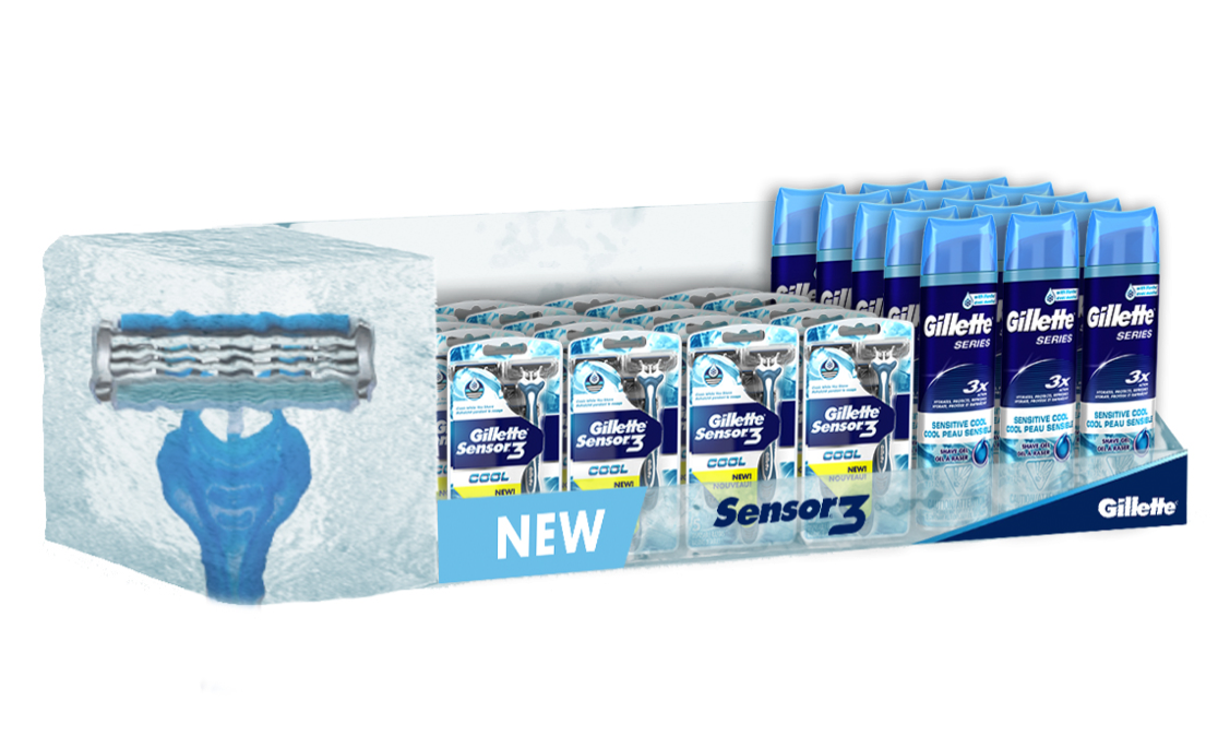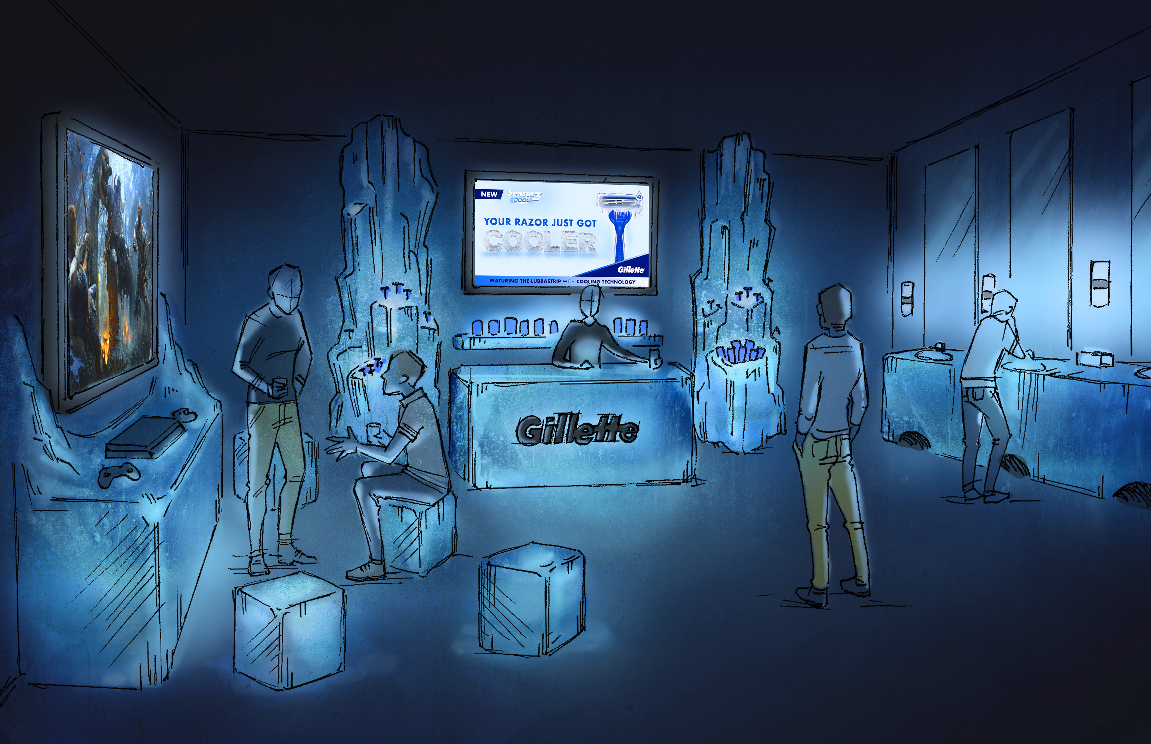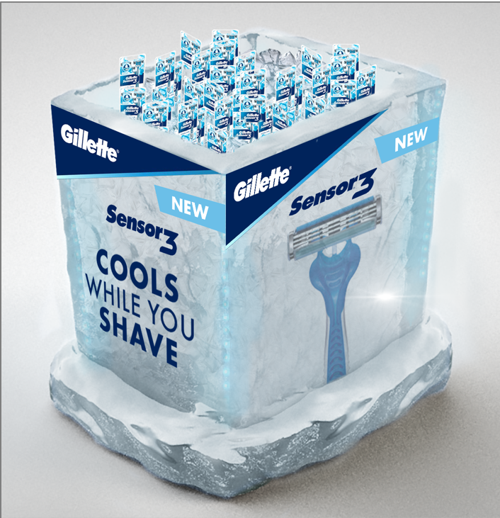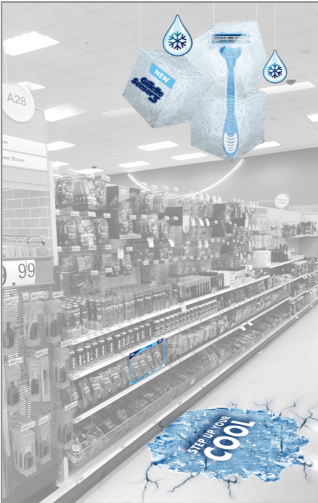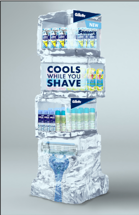 ACD - CREATIVE LEAD/ART DIRECT/DESIGN/SKETCH: Created a full multi-department take over for the launch of the Gillette Sensor 3 Cool razor. Roadshow environment set up in Boston, home of Gillette. In-store executions.